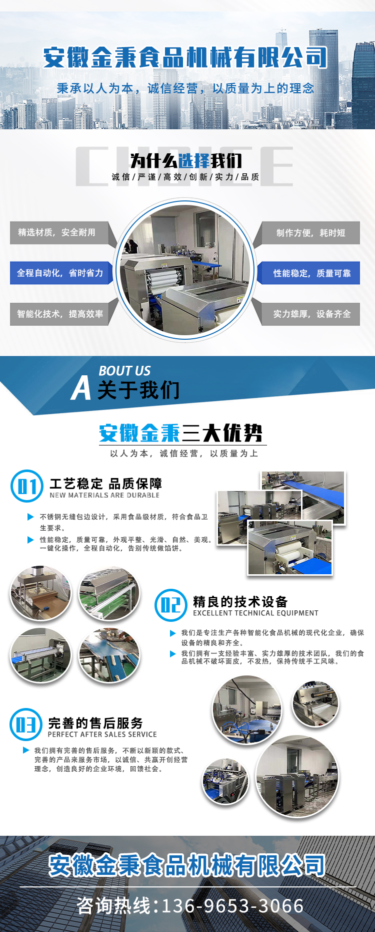 金秉食品機械有限公司是一家專業從事食品機械研制、開發、生產、銷售、集科、工、貿為一體的現代化企業。本公司以客戶需求為導向、技術創新為源泉,不斷研制出符合行業特性、實用性強、適合市場需求的高新技術產品。公司擁有健全的技術、生產、質檢銷售和售后體系,可根據客戶需求進行個性化定制,提供食品工藝技術支持。